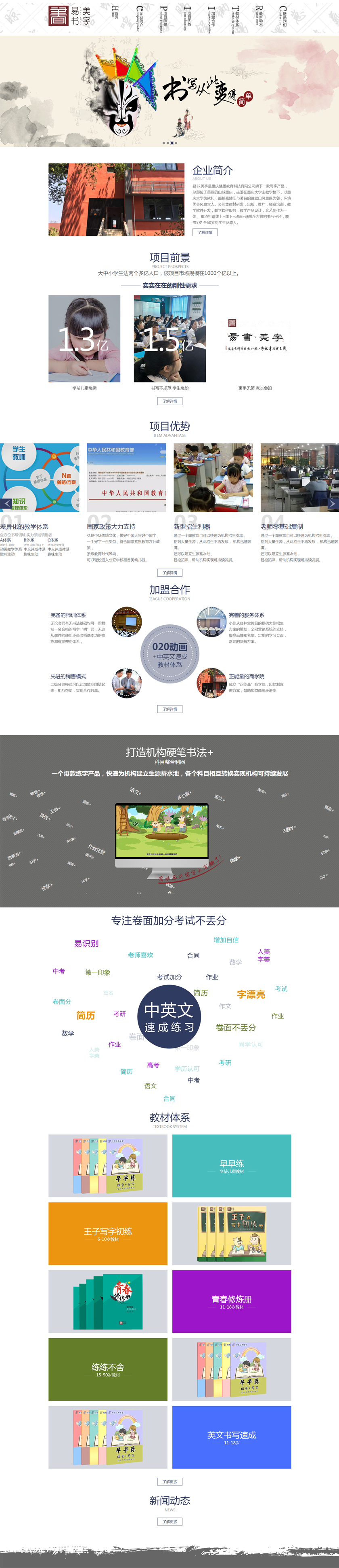 Project Description 易书.美字练字是重庆慧墨教育科技有限公司旗下一款写字产品,总部位于美丽的山城重庆,坐落 在重庆大学主教学楼下,以重庆大学为依托,面朝嘉陵江与著名的磁器口风景区为邻,环境优美 风景宜人。公司集教材研发,出版,推广,师资培训,教学软件开发,教学软件服务,教学产品 设计,文艺创作为一体,重点打造线上+线下+动画+速成全方位的书写平台,覆盖5岁至50岁的学 ... Official website address 阿拉善# I want to share