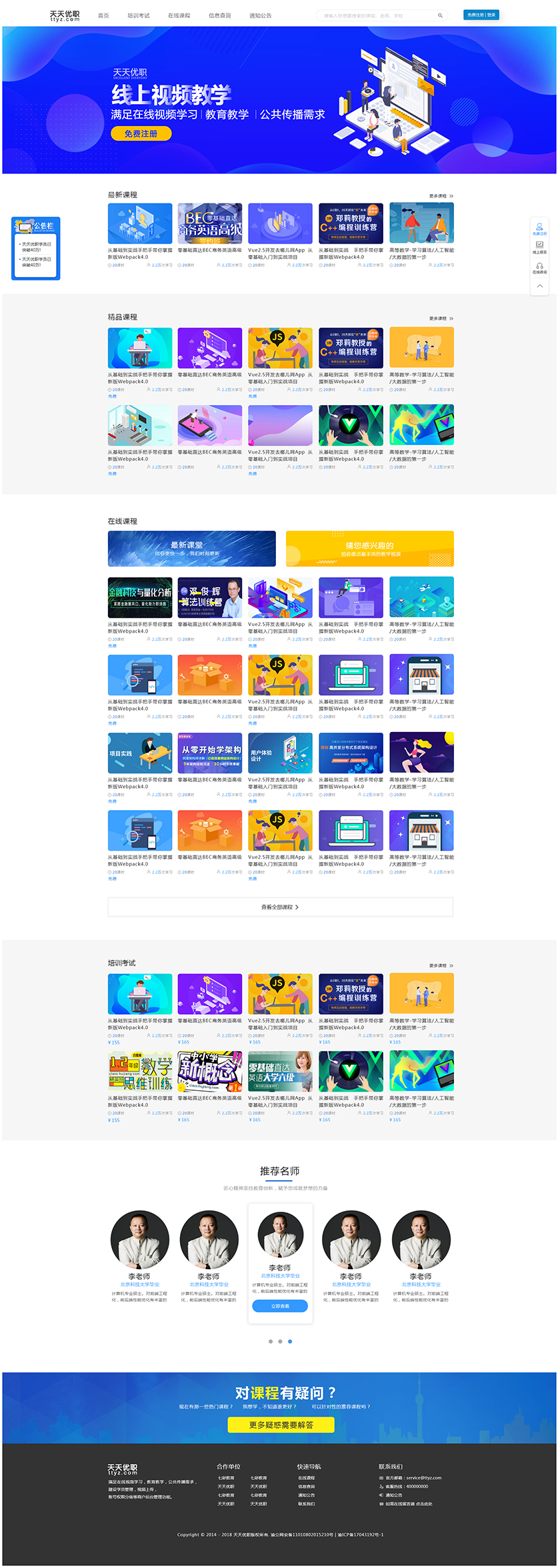 Project Description 满足在线视频学习,教育教学,公共传播需求, 建设学员管理,视频上传, 账号权限分级等商户后台管理功能 Official website address 阿拉善http://tiantianyouzhi.com/ I want to share